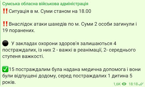 18:23 В Сумах в результате удара беспилотников уже двое погибших и 19 раненых.