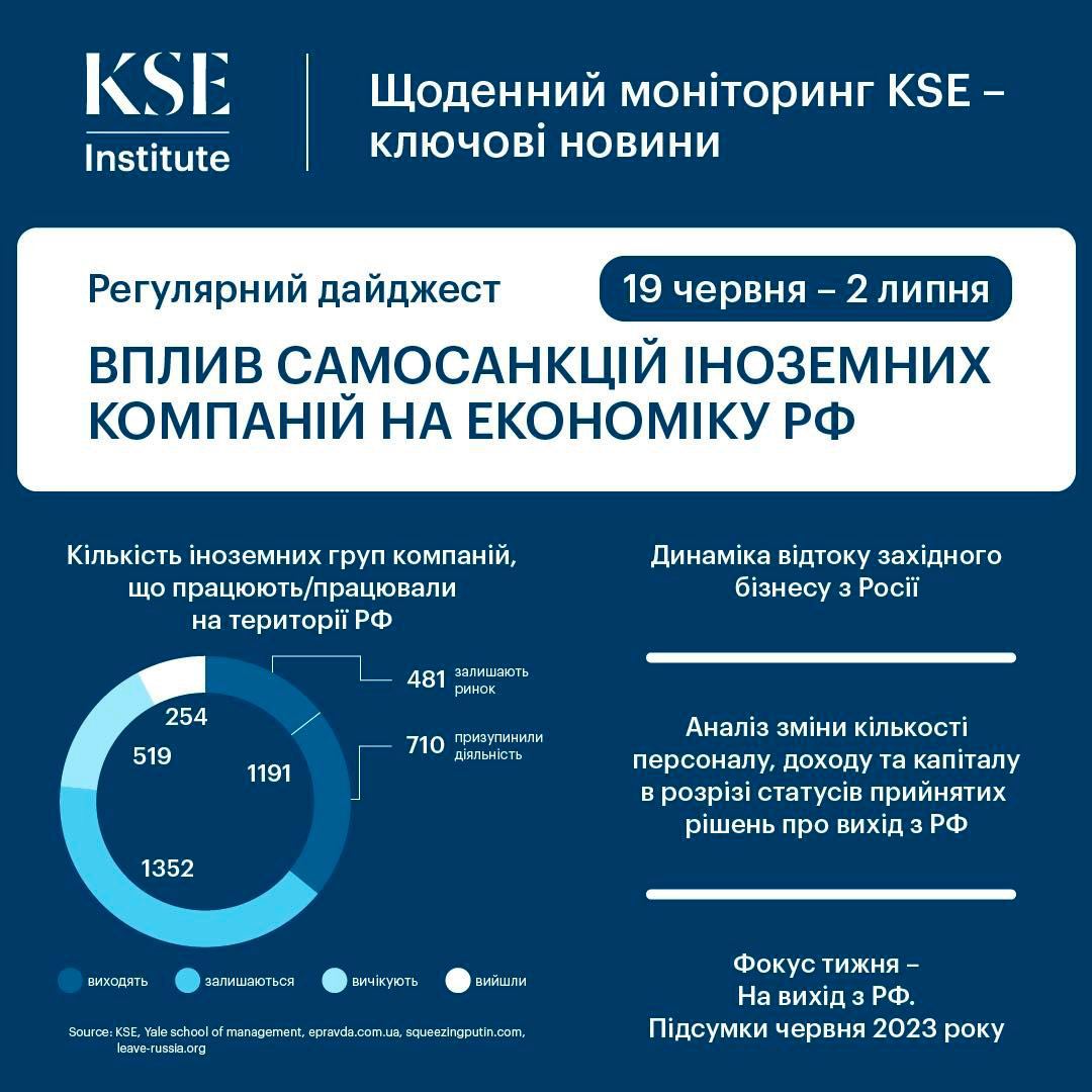 "Если с начала российского вторжения в Украину процент компаний, сворачивающих операции в РФ, резко возрастал до середины апреля 2022 г., то в течение последних 10 месяцев соотношение уходящих или остающихся практически не меняется, хотя мы все еще видим периодический рост доли компаний, остающихся на рынке РФ (за счет добавления новых компаний в базу, 49 было добавлено в июне 2023 г.). Тем не менее, если оперировать общими цифрами в базе данных KSE, около 35,9% компаний уже заявили о выходе с рынка РФ или приостановили свою деятельность, но 40,8% все еще остаются присутствующими в стране, 15,7% выжидают и только 7,7% осуществили полный выход", - сказано в документа.