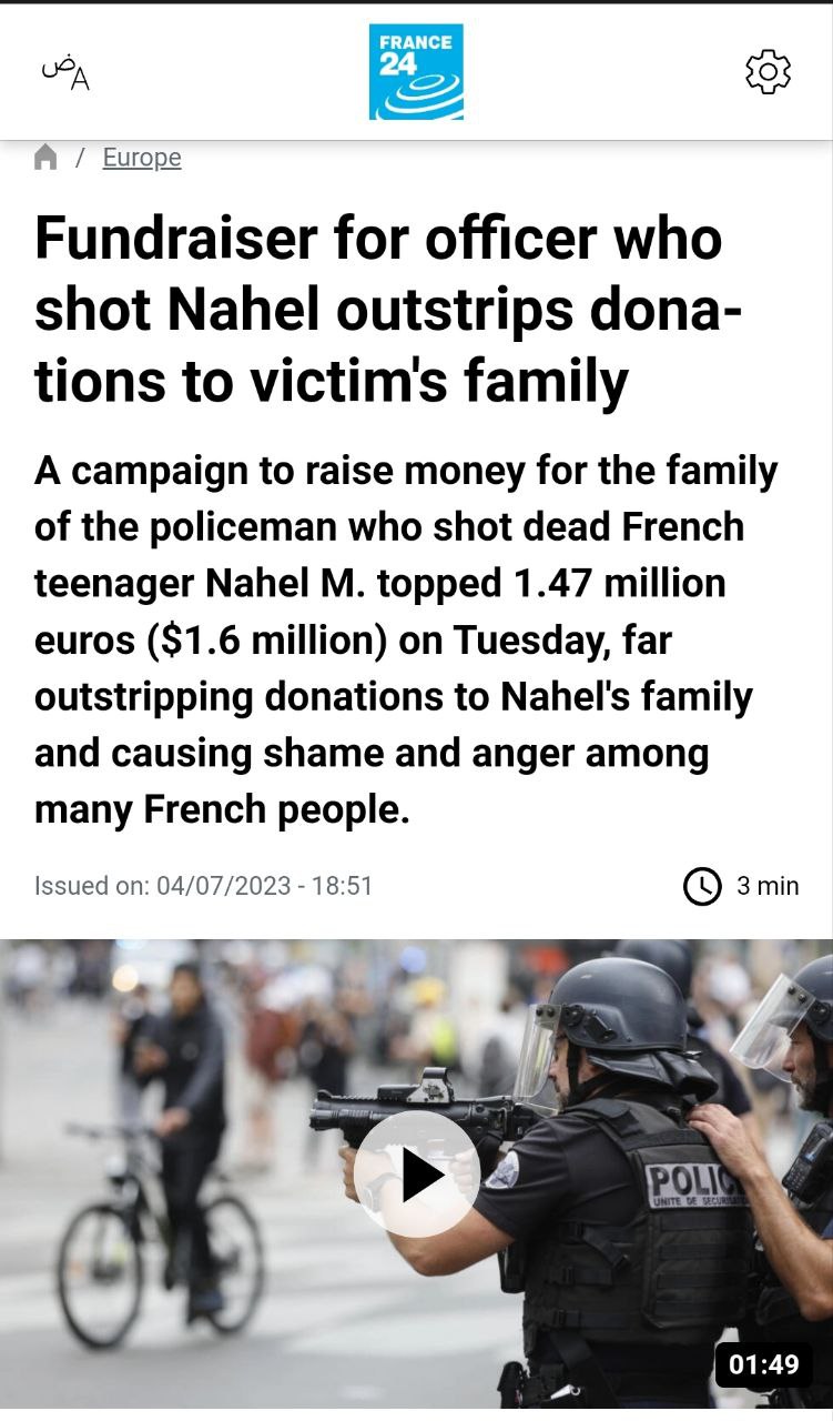 Во Франции пожертвовали больше денег правоохранителю, застрелившему подростка, чем семье погибшего