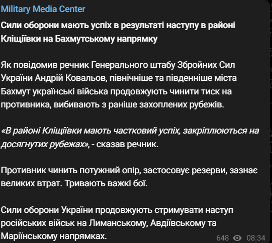 Генштаб сообщает об успехах ВСУ в районе Клещеевки, южнее Бахмута. Украинские войска продолжают оказывать давление на противника на южном и северном флангах Бахмута, выбивая из ранее захваченных рубежей.