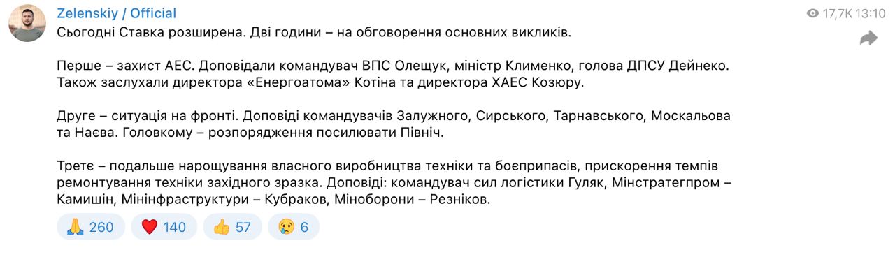 Зеленский провел заседание Ставки, на ней обсудили ситуацию на ЗАЭС и на фронте