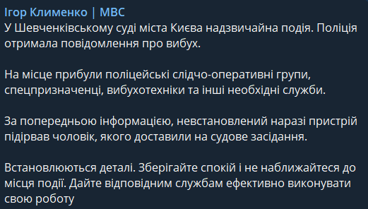 Глава МВД Игорь Клименко подтверждает взрыв в Шевченковском суде.