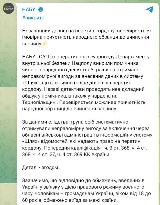 Вскоре после появления поста Мосийчука само НАБУ заявило о разоблачении помощницы народного депутата, которая занималась организацией незаконного пересечения границы через программу "Шлях".