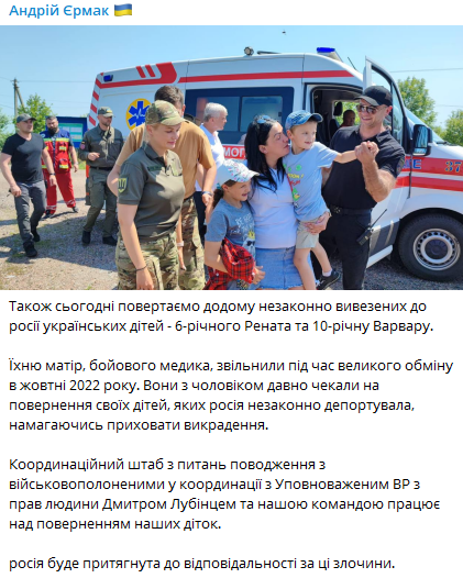 "Их мать, боевого медика, освободили во время большого обмена в октябре 2022 года. Они с мужем давно ждали возвращения своих детей, которых Россия незаконно депортировала, пытаясь скрыть похищение", - пишет глава ОП.