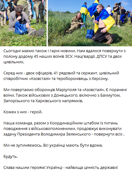 Среди вернувшихся домой два офицера, 41 рядовой и сержант, гражданский сотрудник "Азовстали" и теробороновец из Херсона. У некоторых пленных имеются ранения. Они воевали на донецком, в том числе бахмутском, запорожском и харьковском направлениях.