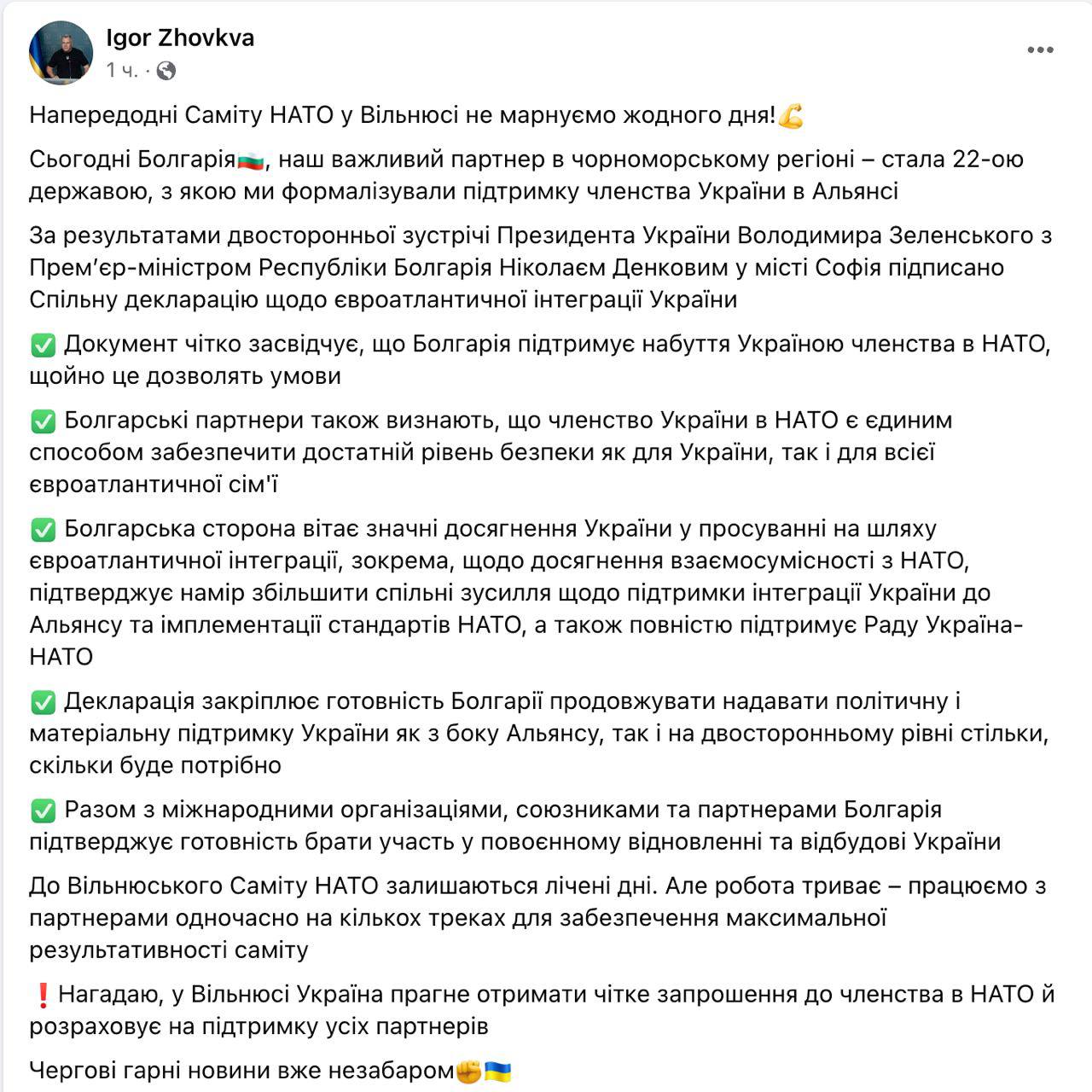 Таким образом, Болгария стала 22-м государством, с которым Украина формализовала поддержку членства в Альянсе.