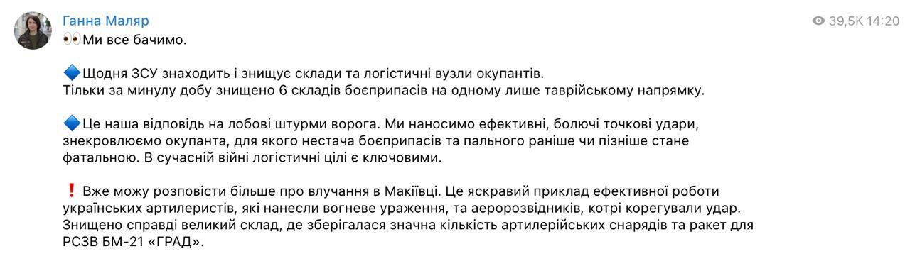"Уничтожен действительно большой склад, где хранилось значительное количество артиллерийских снарядов и ракет для РСЗО БМ-21 "Град", - сообщила Маляр.