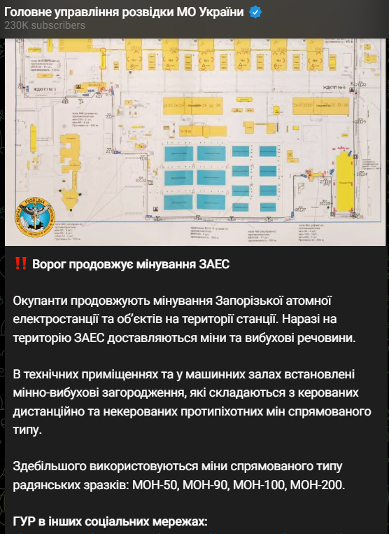 11:30 Россияне продолжают минирование Запорожской атомной электростанции и объектов территории станции. На территорию ЗАЭС доставляются мины и взрывчатые вещества.