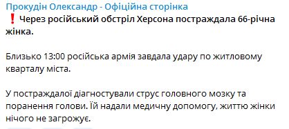 Из-за российских обстрелов пострадала 66-летняя женщина. У пострадавшей диагностировали сотрясение головного мозга и ранение головы. Ей оказали медицинскую помощь, жизни женщины ничего не угрожает.