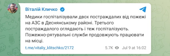 Мэр Киева Виталий Кличко рассказал, что медики госпитализировали двух пострадавших от пожара на АЗС. Третьего пострадавшего осматривают и тоже госпитализируют.