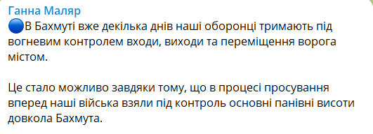 "Это стало возможным благодаря тому, что в процессе продвижения вперед наши войска взяли под контроль основные господствующие высоты вокруг Бахмута", - отмечает она.