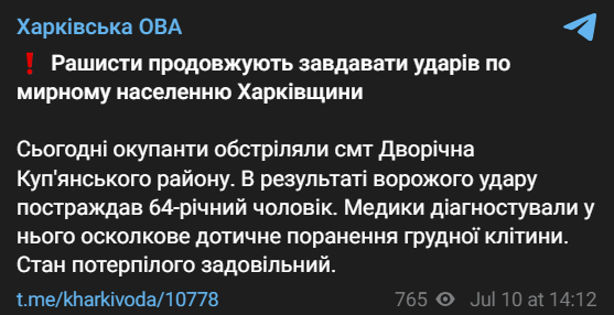 "Сегодня оккупанты обстреляли пгт Двуречная Купянского района. В результате вражеского удара пострадал 64-летний мужчина. Медики диагностировали у него осколочное касательное ранение грудной клетки. Состояние пострадавшего удовлетворительное", - сообщили в ОВА.