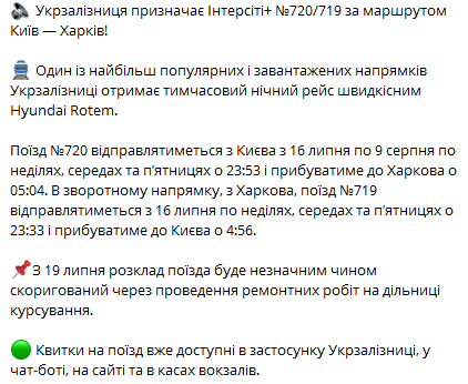 - из Киева поезд №720 будет отправляться с 16 июля по 9 августа по воскресеньям, средам и пятницам в 23:53 и прибывать в Харьков в 05:04;