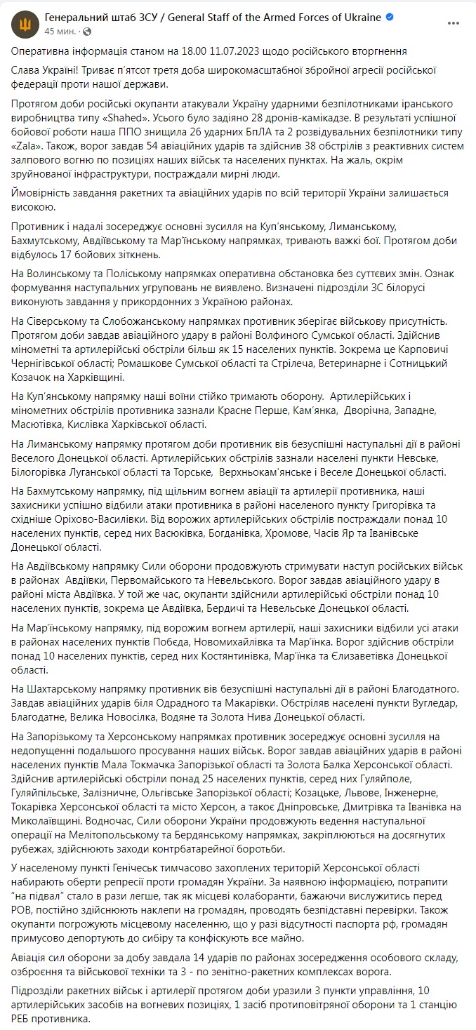 Генштаб ВСУ опубликовал оперативную информацию о российском вторжении по состоянию на 18:00 11 июля.