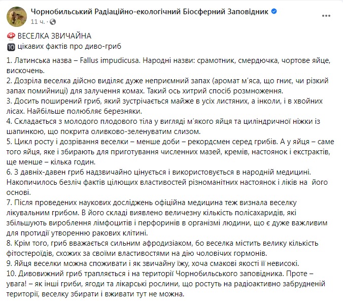 Чернобыльский радиационно-экологический биосферный заповедник опубликовал подборку интересных фактов о грибе весёлка обыкновенная. Другие его названия - фаллюс нескромный, сморчок вонючий и сморчок подагрический.