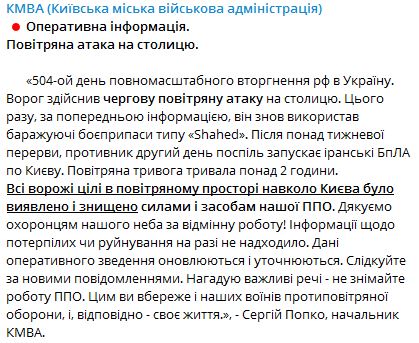 Воздушная тревога продолжалась более двух часов. Все цели в воздушном пространстве вокруг Киева были обнаружены и уничтожены силами ПВО. Информации о пострадавших или разрушении в данный момент не поступало.