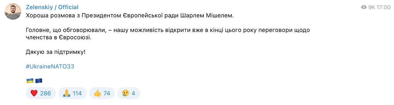 "Хороший разговор с президентом Европейского совета Шарлем Мишелем. Главное, что обсуждали – нашу возможность открыть уже в конце этого года переговоры по членству в Евросоюзе", - сообщил Зеленский.