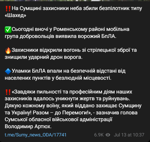 В Роменском районе Сумской области мобильная группа добровольцев сбила беспилотник "Шахед" из стрелкового оружия.