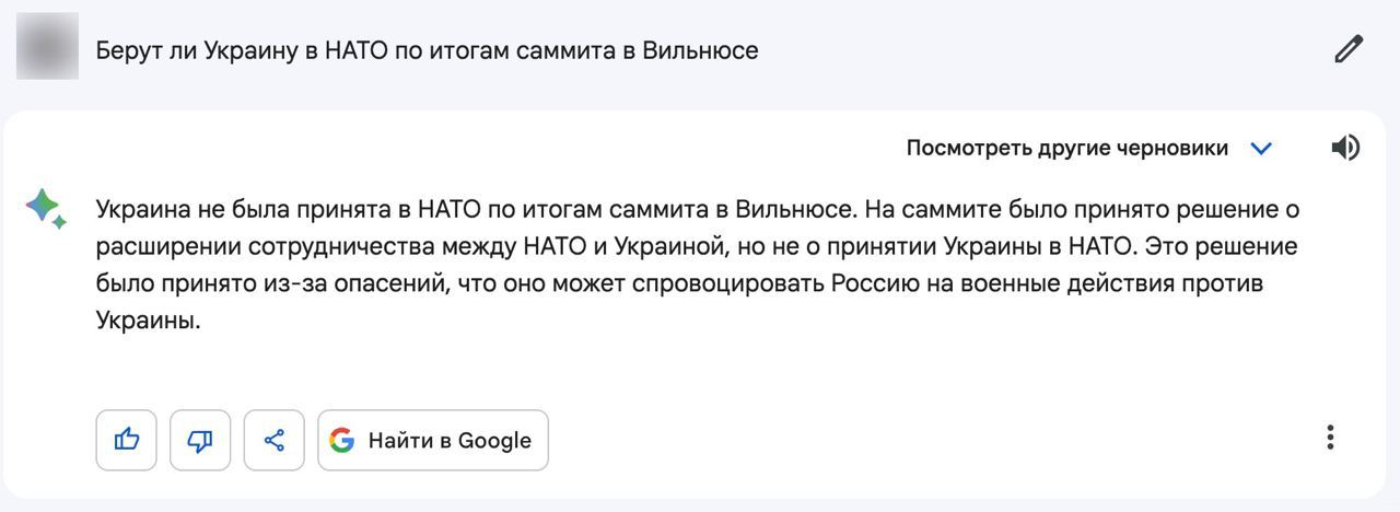 "Украина не была принята в НАТО по итогам саммита в Вильнюсе. На саммите было принято решение о расширении сотрудничества между НАТО и Украиной, но не о принятии Украины в НАТО. Это решение было принято из-за опасений, что оно может спровоцировать Россию на военные действия против Украины".
