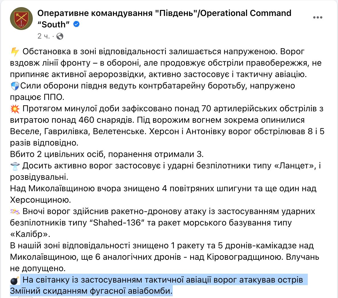 "На рассвете с применением тактической авиации враг атаковал остров Змеиный сбросом фугасной авиабомбы", - говорится в сообщении.