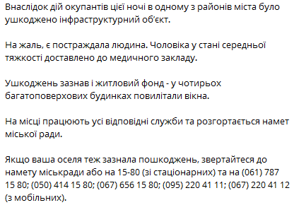 Глава Запорожской областной военной администрации Юрий Малашко сообщил, что в Запорожье из-за вражеской атаки дронов ранения получил 62-летний мужчина. Всего РФ совершила 45 обстрелов по мирным городам и селам за минувшие сутки. Зафиксировано 27 разрушений объектов жилищной и социальной инфраструктуры в 15 населенных пунктах Запорожской области.
