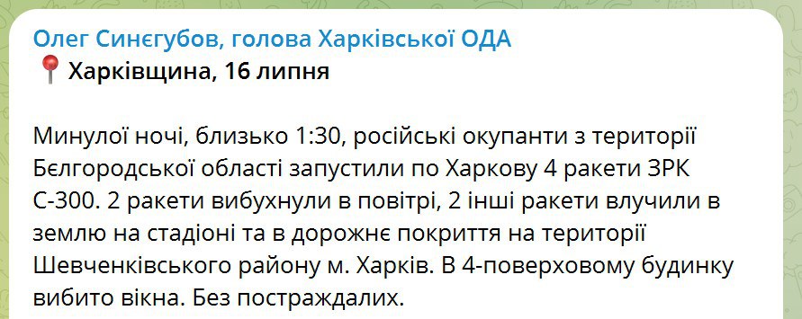 19:33 После удара по Основянскому району Харькова есть четверо пострадавших, сообщил губернатор области Синегубов.
