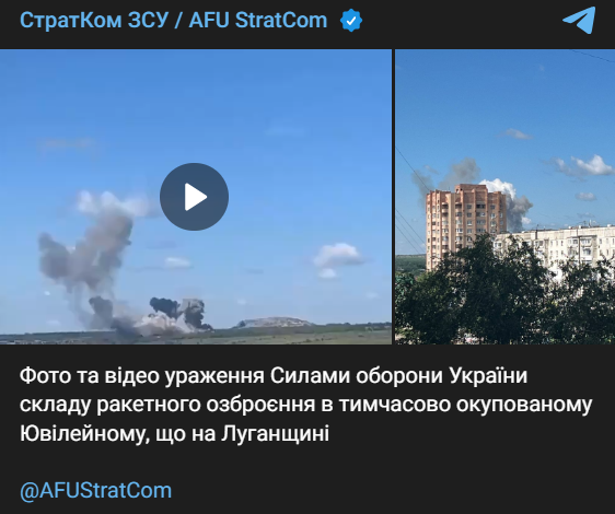 15:55 Украинское командование подтвердило удар по Луганску. Сообщается, что в поселке Юбилейный поражен склад ракетного вооружения.