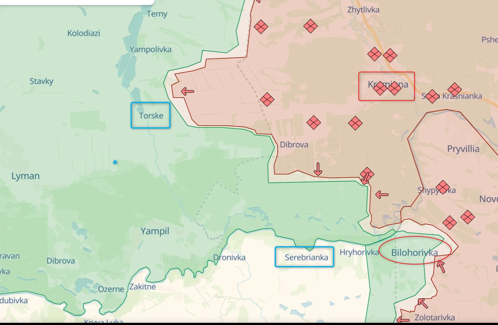 1. На южном фланге этого фронта просматривается попытка создать угрозу с севера для Северска и Белогоровки, выйдя на левый берег Северского Донца. Для этого идет наступление в сторону Лимана и в Серебрянском лесничестве.