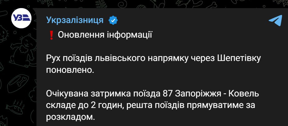 8:24 Движение поездов через Шепетовку Хмельницкой области возобновлено.