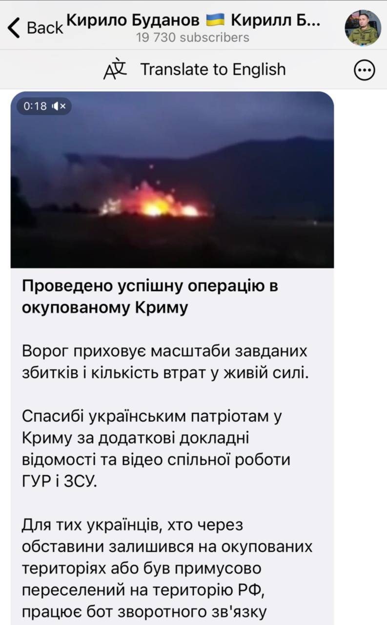 10:02 Глава разведки Кирилл Буданов заявил, что детонация склада с боеприпасами в Крыму - результат операции ГУР и ВСУ.