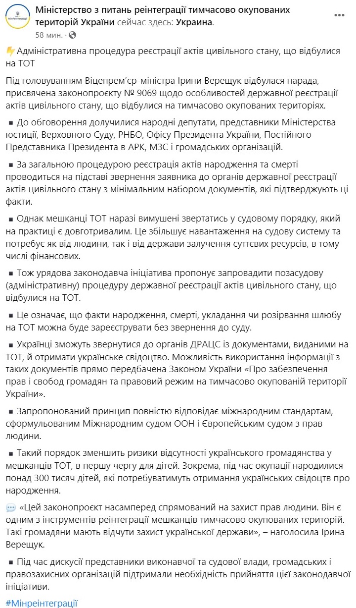 "Такой порядок уменьшит риски отсутствия украинского гражданства у жителей ВОТ, в первую очередь для детей. В частности, во время оккупации родились более 300 тысяч детей, нуждающихся в получении украинских свидетельств о рождении", – говорится в сообщении.
