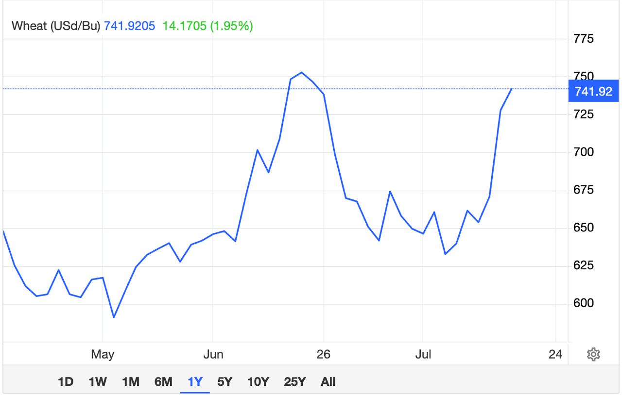 Сегодня фьючерсы на пшеницу на торгах в Чикаго выросли на 1,6% и достигли трехнедельного максимума на фоне растущих опасений, что атака на украинские порты после выхода России из зерновой сделки окажет долгосрочное влияние на мировые поставки.