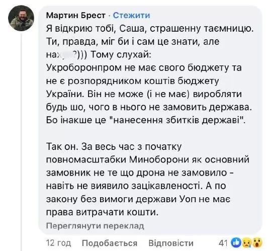 "Он ("Укроборонпром") не может (и не должен) производить что-либо, что у него не закажет государство. Иначе это "нанесение ущерба государству". Так вот. За все время с начала полномашстабки Минобороны как основной заказчик не то что дрона не заказало - даже не проявило заинтересованности. А по закону без требования государства "Укроборонпром" не имеет права тратить средства", - заявил Болдырев.
