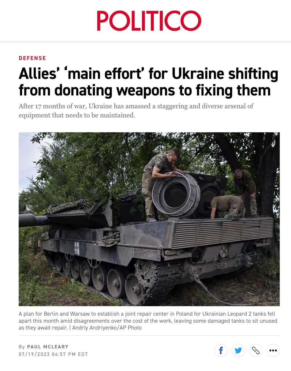 Акцент западной помощи Украине постепенно смещается с предоставления техники к ее ремонту, пишет Politico.
