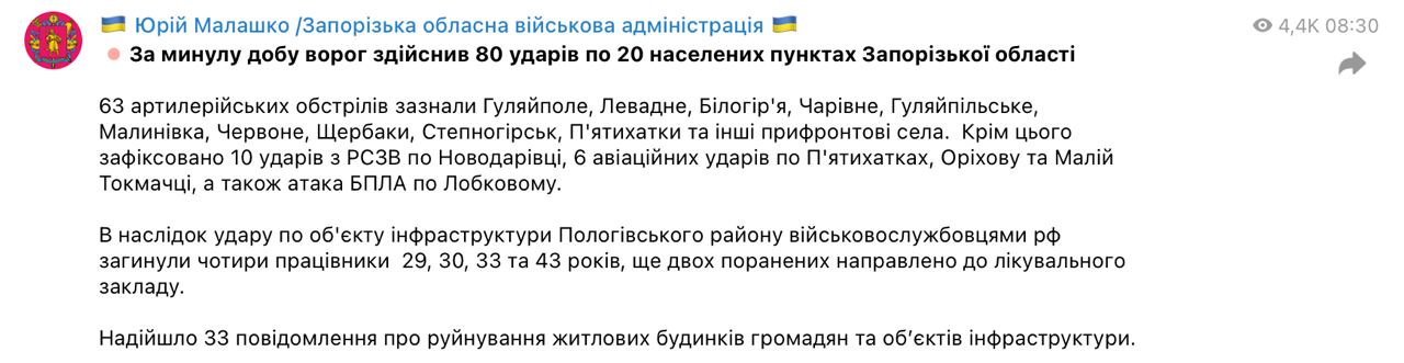 9:51 В Запорожской области РФ ударила по объекту инфраструктуры в Пологовском районе, погибли четыре работника предприятия, сообщает ОВА. Еще двое получили ранения.