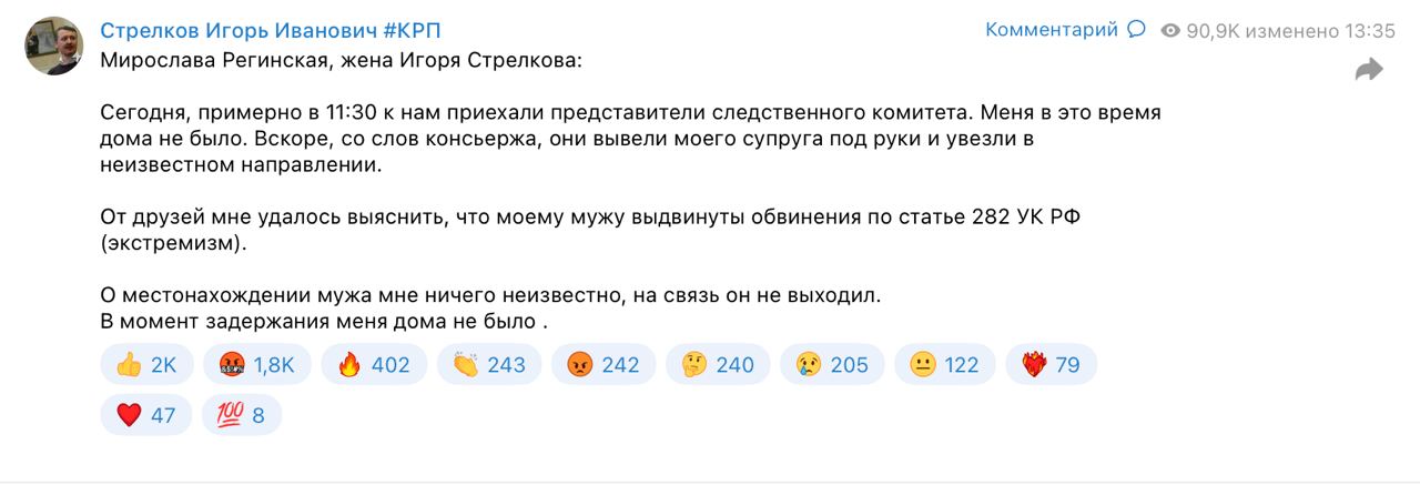 13:50 В России задержали Игоря Гиркина-Стрелкова. Об этом сообщила его супруга.