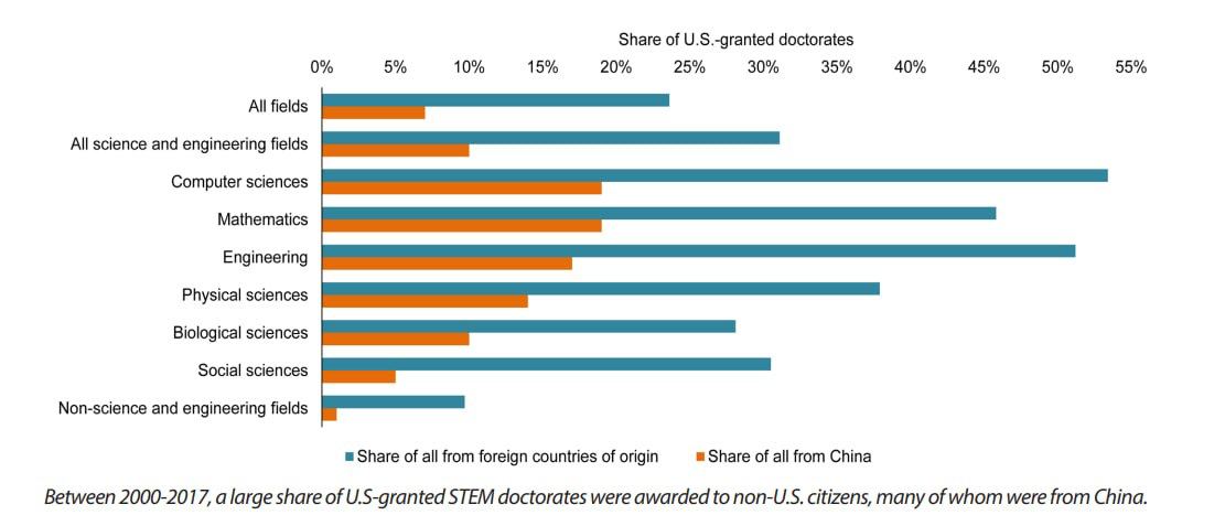 В стране размышляют, приносят ли иностранные граждане, обучающиеся и работающие в США, больше выгоды экономике или убытков от краж идей и технологий. Исследователи установили, что в 2019 году работники STEM, родившиеся за границей, добавили почти 2% к ВВП США, или 367–409 миллиардов долларов.