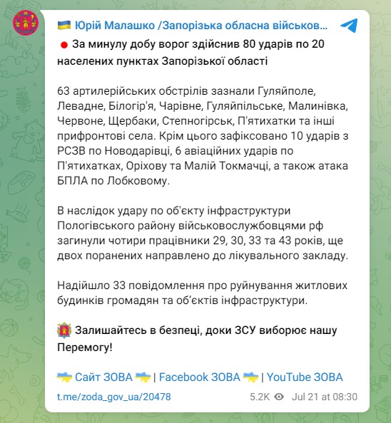 Всего за минувшие сутки РФ нанесла 80 ударов по 20 населенным пунктам области. 63 артиллерийским обстрелам подверглись Гуляйполе, Левадное, Белогорье, Волшебное, Гуляйпольское, Малиновка, Красное, Щербаки, Степногорск, Пятихатки и другие прифронтовые села. Кроме этого, зафиксировано 10 ударов из РСЗО по Новодаровке, шесть авиационных ударов по Пятихаткам, Орехову и Малой Токмачке, а также атака БПЛА по Лобковому.
