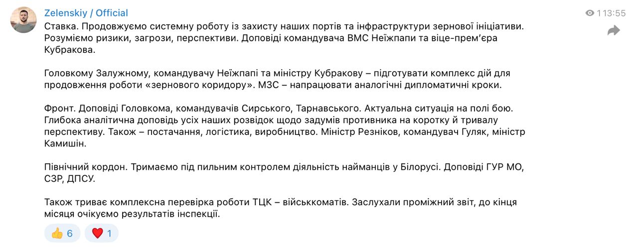 "Продолжаем системную работу по защите портов и инфраструктуры зерновой инициативы. Понимаем риски, угрозы, перспективы", - пишет президент.