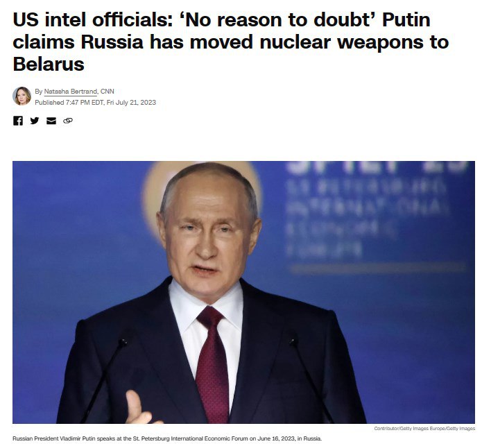 08:13 Американская разведка подтверждает, что российское тактическое ядерное оружие уже размещено в Беларуси. "Нет причин сомневаться в этом", - цитирует CNN представителей разведсообщества.