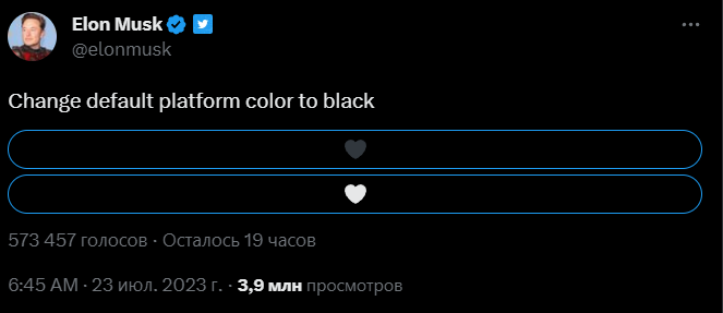 Кроме того, он запустил опрос с предложением изменить цвет платформы по умолчанию на черный. На данный момент в голосовании приняли участие более 500 тысяч пользователей Твиттера. Две трети поддерживают предложение поменять базовый цвет соцсети на черный.