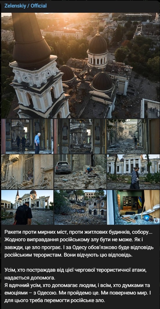 "Ракеты против мирных городов, против жилых домов, собора... Никакого оправдания российскому злу быть не может. Как всегда, это зло проигрывает. И за Одессу обязательно будет ответ российским террористам. Они почувствуют этот ответ", - написал Зеленский.
