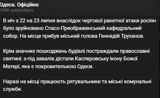 Одесский городской совет сообщил, что кроме значительных повреждений здания пострадали православные святыни. Из-под завалов достали Касперовскую икону Божией Матери, которая является покровительницей Одессы.