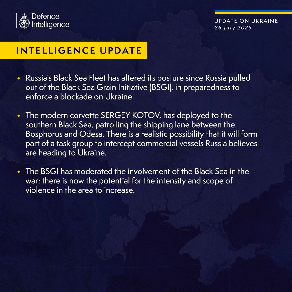 РФ передислоцировала суда Черноморского флота после выхода из "зерновой сделки", что может свидетельствовать о подготовке к морской блокаде Украины и эскалации боевых действий в море, сообщает британская разведка.