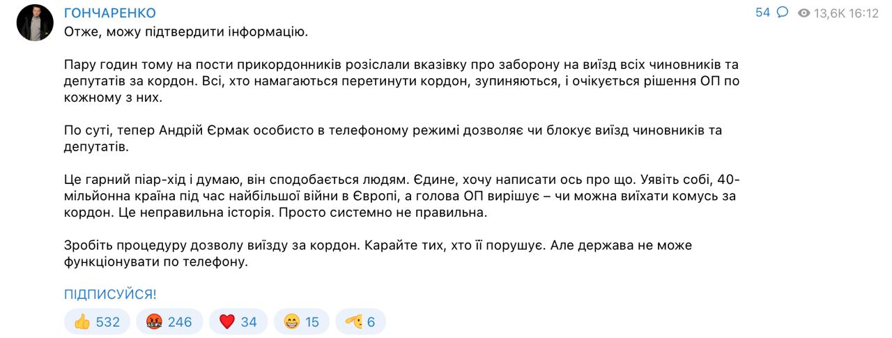 "Все, кто пытается пересечь границу, останавливаются, и ожидается решение ОП (Офиса президента - Ред.) по каждому из них. По сути, теперь Андрей Ермак лично в телефонном режиме разрешает или блокирует выезд чиновников и депутатов", - написал Гончаренко.