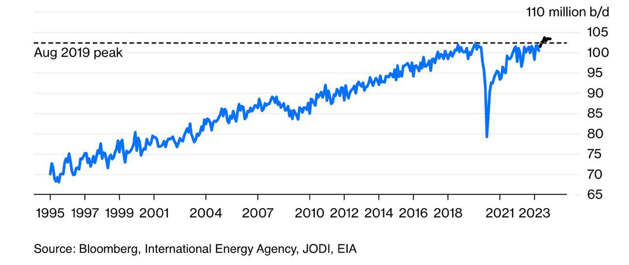 Агентство Bloomberg пишет, что потребление нефти в последние недели достигло рекордного уровня - около 102,5 млн баррелей в день, превысив предыдущий пиковый показатель 2019 года.