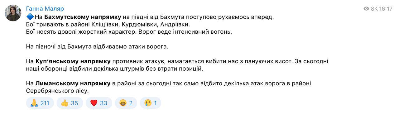 В своем телеграм-канале Маляр только написала, что ВСУ продолжают двигаться южнее Бахмута и отбивают атаки севернее города.