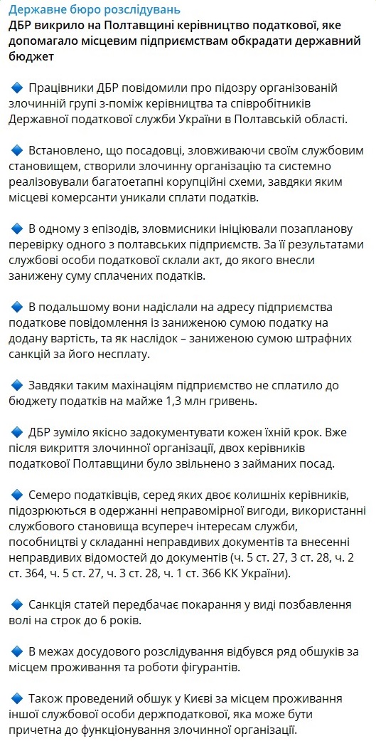 Сотрудники ГБР сообщили о подозрении организованной преступной группе среди руководства и сотрудников Государственной налоговой службы Украины в Полтавской области.