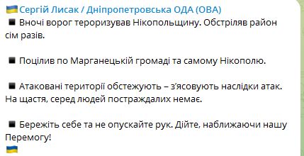 Об этом сообщил глава Днепропетровской ОВА Сергей Лысак в своем тг-канале.
