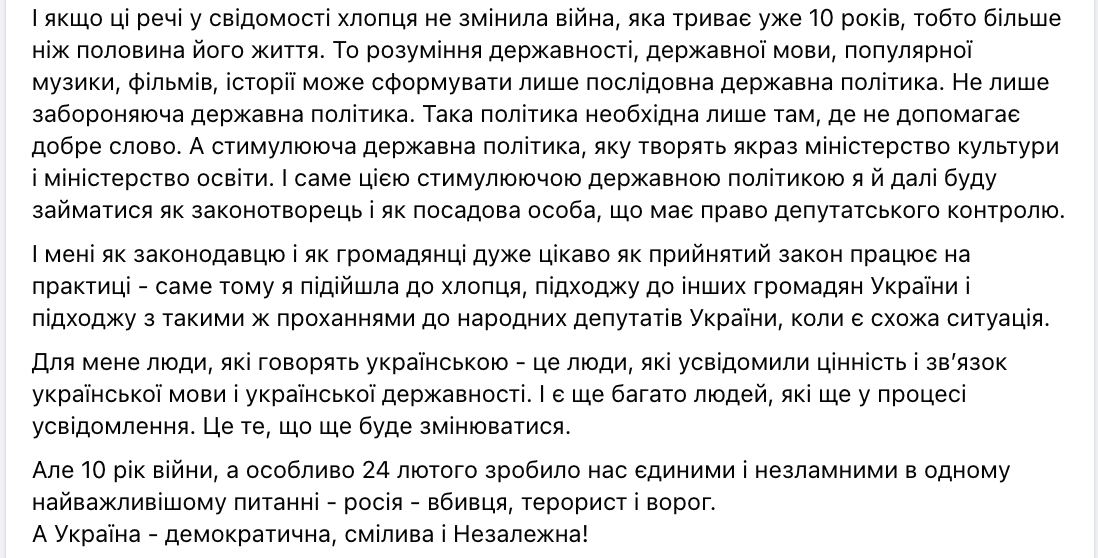 "Только после отказа и мата я начала снимать видео и вызвала полицию. И когда я говорила, что он нарушил закон, то он нарушил ст. 173 Кодекса Украины об административных правонарушениях и Решении ЛОС о русскоязычном культурном продукте", - пишет депутат.